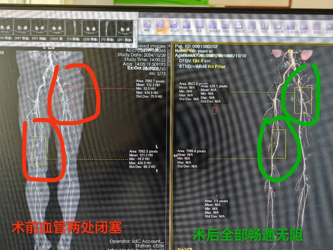 面对大叔的病情,传统治疗路径显得力不从心。介入血管外科团队采用前沿的杂交技术——小切口内膜剥脱术结合介入斑块旋切技术,实现了双下肢闭塞血管的一次性复通。这一无支架技术,通过血管造影、球囊扩张、机械斑块切除及导管接触溶栓的精准组合,不仅避免了支架植入的异物恐惧,还展现了全微创、无残留、高通畅率的显著优势。手术仅用时2小时,1处小切口,1次治疗,复通双腿动脉,术后6小时大叔便能自由行走,见证了现代医学的奇迹。