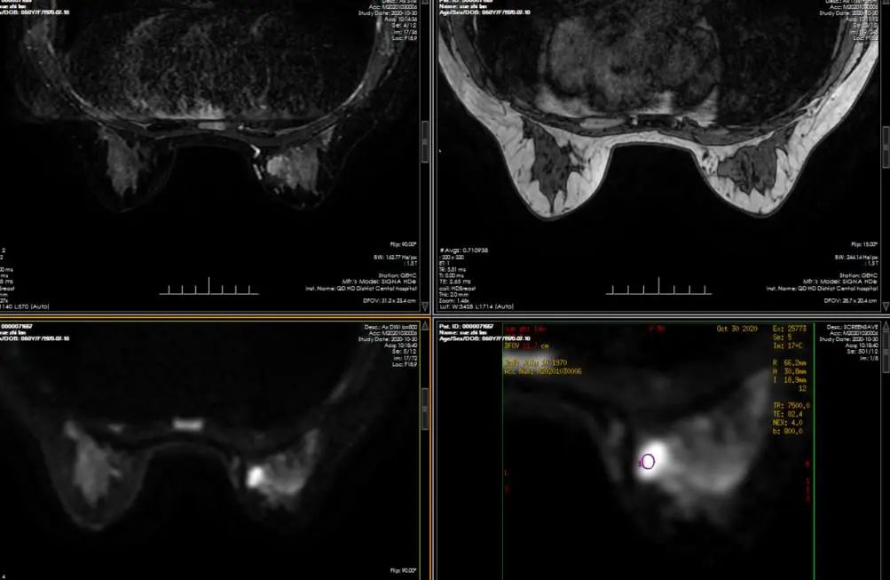 乳腺MRI具有多参数、多序列及功能成像的优势。可评估肿瘤的形态学、血流动力学及组织功能代谢等改变。MRI应用动态增强多参数以及扩散加权成像中获得的ADC值有助于乳腺良恶性病变的鉴别诊断,实现了形态学+血流动力学+分子生物学,其敏感性94%-100%,特异性80%-97%。目前MRI因其具有的独特优势已成为乳腺癌新辅助治疗(NAT)疗效评估的常规影像学检查方法,其作用明显优于乳腺X线摄影及超声检查。诊断符合率高达97%,能发现X线、超声无法发现的早期和微小乳腺癌,能检出的最小乳腺癌为1mm;对有乳腺癌家族史、携带乳腺癌相关基因的妇女,应较早接受MRI检查;检查尽量在月经周期第2周进行。