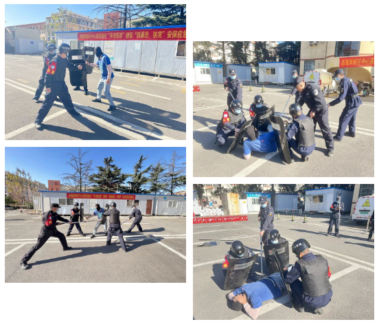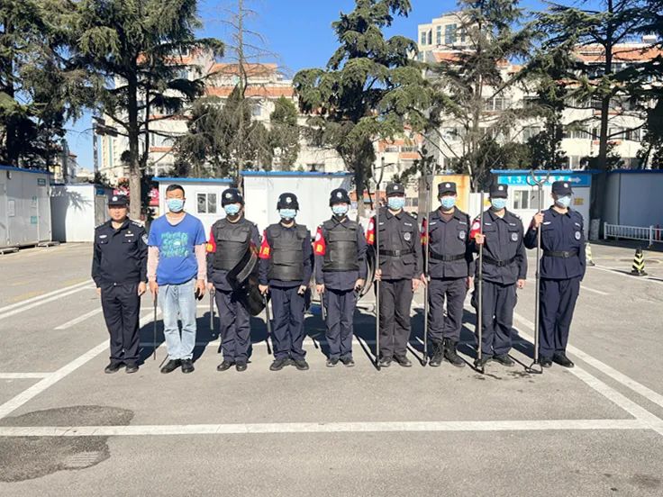 与此同时,医院“防暴恐、防突发”安保应急演练随即展开。模拟暴恐分子闯入2号楼西侧停车场,打砸破坏、制造混乱。医院安保团队按最小应急单元预案行动,手持盾牌、警棍与暴恐分子周旋,并迅速报告指挥中心,请求支援。现场职工积极参与秩序维护与人员疏散,展现良好协同能力。长江路派出所驻医院警务室社区民警邵军接警后迅速赶到现场,与安保人员协作,成功制服暴恐分子,化解危机。整个安保防恐演练紧张刺激,环节紧密衔接,检验了医院与公安部门在应对突发事件时的联动机制和应急处置能力。