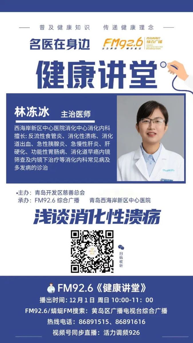12月1日上午10点,青岛西海岸新区中心医院消化中心消化内科主治医师林冻冰走进FM92.6《健康讲堂》和我们共聊消化性溃疡。