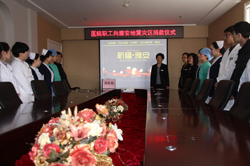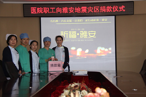 4月20日,四川雅安发生7级地震,造成四川同胞死伤严重,雅安灾情牵动着每一个国人的心。青岛市口腔医院的医务人员纷纷行动起来,积极为雅安灾民捐款献爱心。4月27日,值雅安地震一周,青岛市口腔医院党支部举办了向雅安灾区捐款仪式,向在雅安地震中牺牲的官兵、志愿者和逝去的雅安同胞致以哀悼。口腔人发扬“一方有难、八方支援”的中华民族传统美德,为雅安重建、灾民尽自己一份微薄之力。