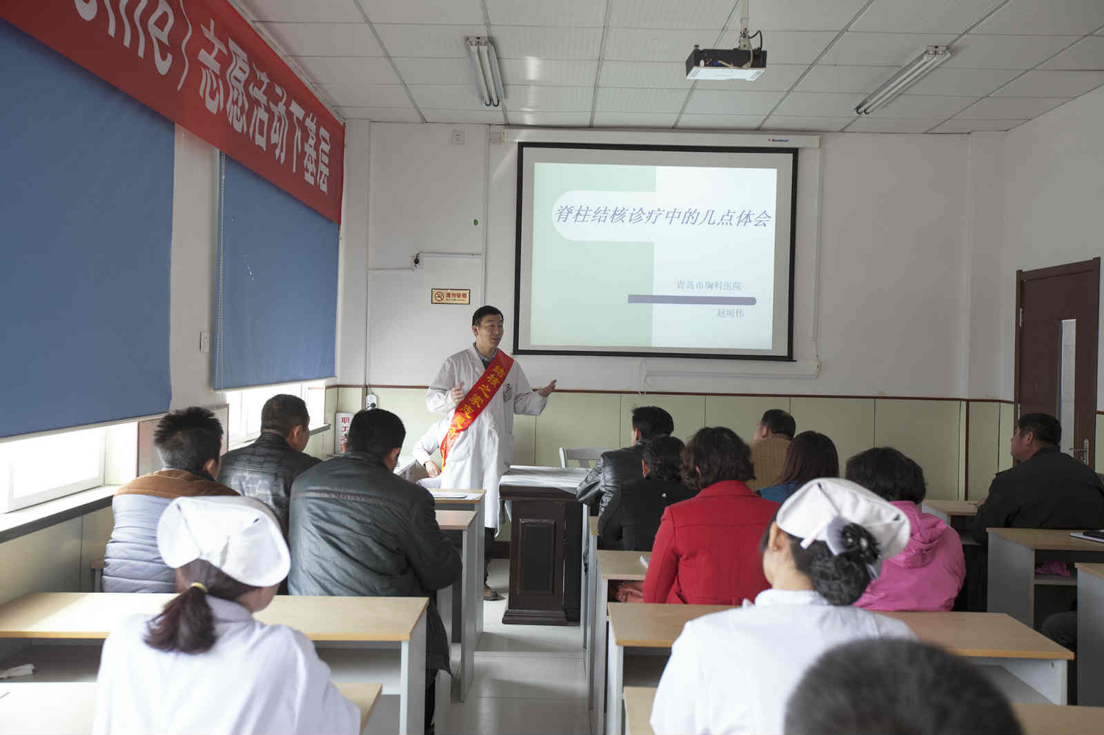 团队义诊、培训活动的第一站是位于即墨市西北方15公里的即墨中医院普东分院,参加本次活动的志愿者由青岛市胸科医院和青岛市疾病控制中心的6位专家组成。活动主要包括结核病义诊,对周围的乡村医生和医院职工进行肺结核早期发现、脊柱结核早期发现的经验培训等。本次活动受到了当地居民和医院职工热烈的欢迎和高度的赞扬。