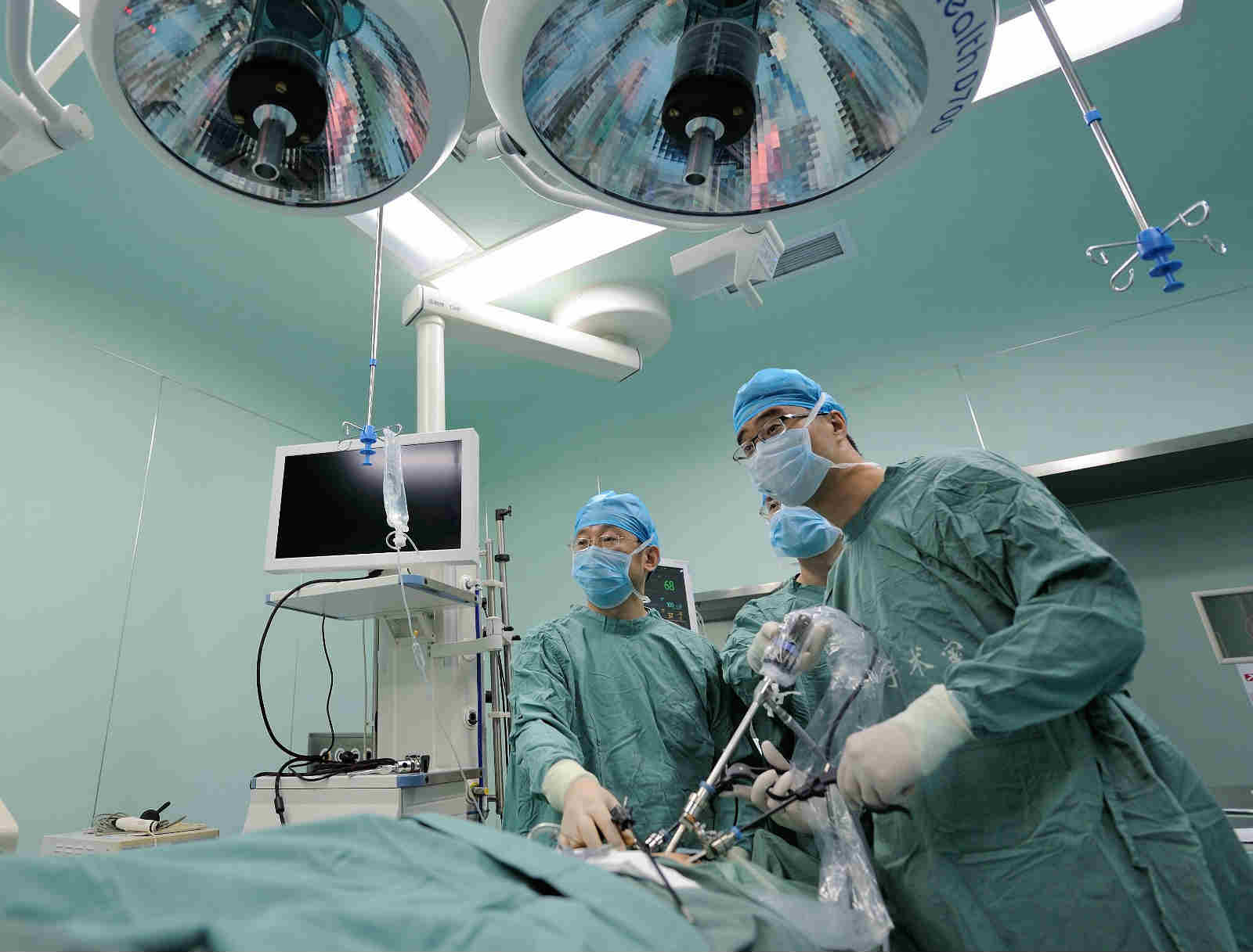 普外科王野主任、张新明副主任医师正在进行腹腔镜手术
