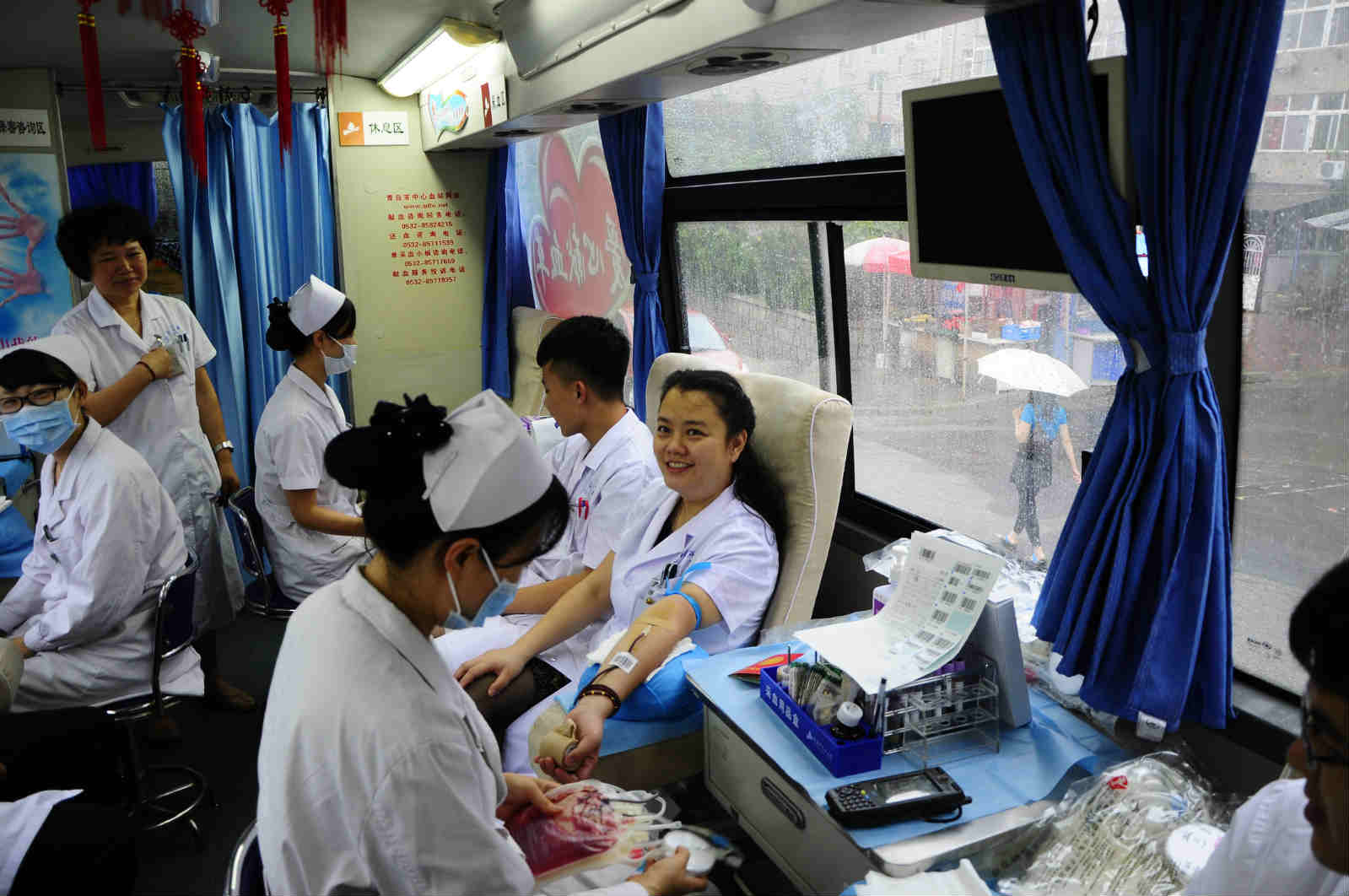 目前岛城进入夏季的高温期,街头参加无偿献血的市民迅速减少,而同期医院临床的医疗急救用血到达高峰值,青岛市中心血站进入血液需求紧张阶段,青岛市精神卫生中心在全市卫生计生系统率先启动医务工作者万人流动血库,主动与市中心血站联系,献血车开进医院,积极开展夏季无偿献血活动。7月23日上午,全院干部职工52人参加无偿献血,参加献血的既有医院的领导、临床一线医务人员,也有行政后勤人员,献血人员比例占到职工总数的15%,献血总量达18100毫升。