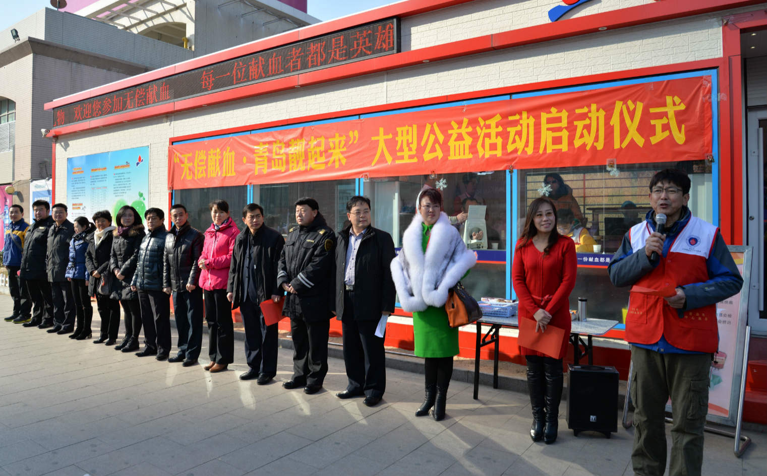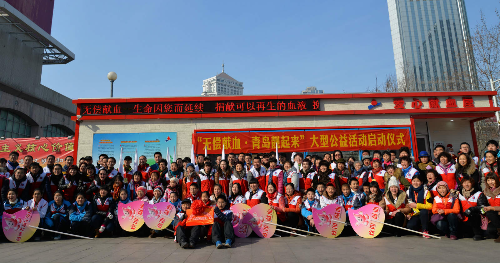 1月31日,以“无偿献血――青岛‘靓’起来”为主题的无偿献血大型公益宣传活动启动仪式在青岛市中心血站市南区永旺东泰献血屋举行。接下来,无偿献血红十字志愿者将首先在全市范围内开展系列活动之一“LED灯亮起来”。活动当天, 100余位无偿献血红十字志愿者和爱心企事业单位代表来到现场助阵,共同见证此次大型公益活动的启动。