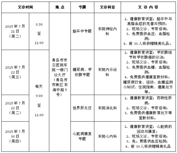 为全面贯彻“进一步改善医疗服务行动”,青岛市市立医院东院推出“健康七月·医疗惠民”健康宣教义诊系列活动。届时,东院内分泌科、神经内科、消化科、心内科等专业的专家,将为市民奉上健康讲座和义诊咨询,通过讲解专科疾病的预防和最新诊疗技术,帮助市民远离疾病困扰,安度盛夏。义诊安排,详见下表: