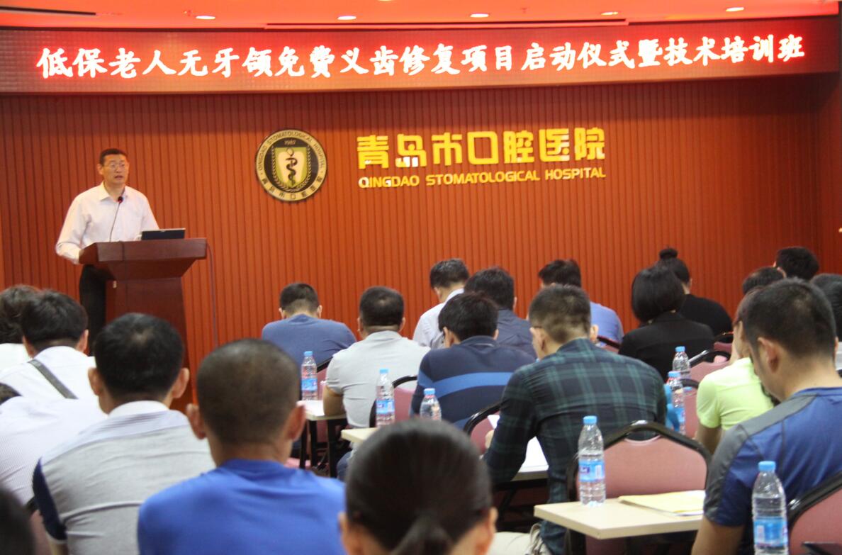 依据项目实施方案文件要求,市卫生和计划生育委员会委托项目管理办公室、市口腔质量控制中心和市口腔医学会联合,于2016年5月27、28日在青岛市口腔医院举办青岛市为60周岁以上低保无牙颌患者免费安装义齿项目启动仪式暨医疗技术培训班。