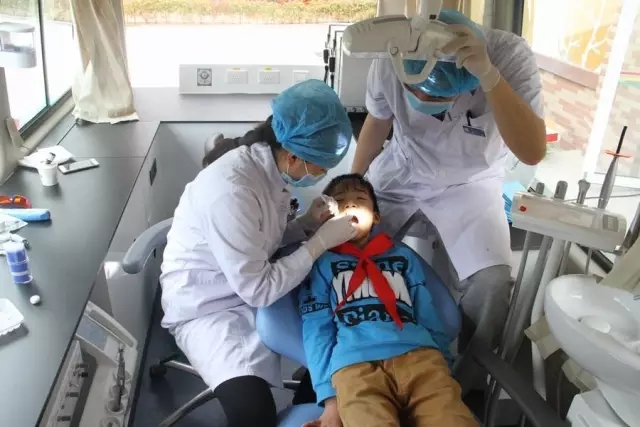 2016年5月20日,青岛开发区第一人民医院口腔科邵丹主任、周楠、陈勇医生随移动式巡回医疗车进入北庄小学为二年级的孩子们进行六龄齿窝沟封闭和全口牙涂氟工作。