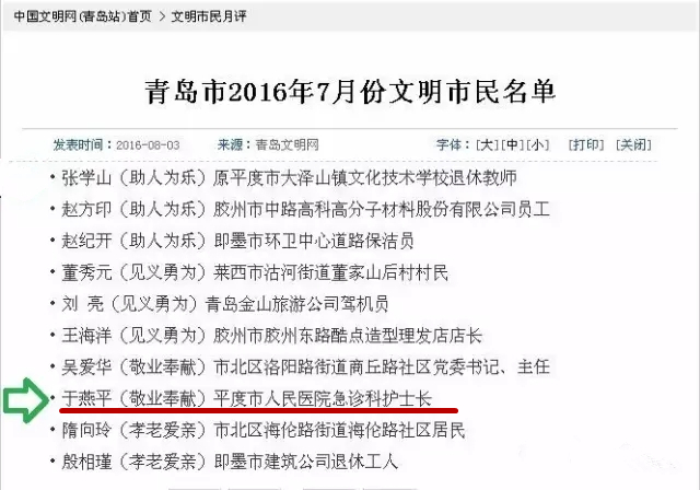热烈庆祝平度市人民医院质量管理办公室主任于燕平荣膺7月份青岛市“文明市民”