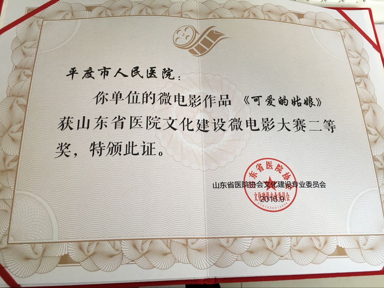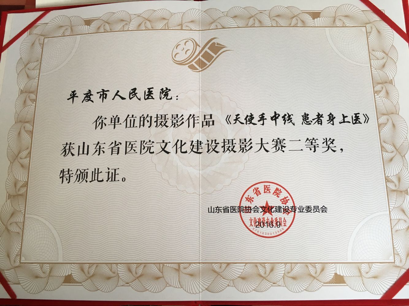 从刚刚结束的山东省医院协会医院文化建设专业委员会年会上获悉,我院报送的两项作品均获得二等奖的好成绩,他们分别是:摄影作品《天使手中线,患者身上医》,获得山东省医院文化建设摄影大赛二等奖。微电影作品《可爱的姑娘》获得山东省医院文化建设微电影大赛二等奖。医院宣传科王琳科长代表医院参加年会并领取奖励证书。
