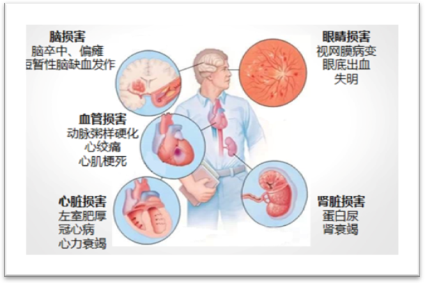 高血压损害心脑肾等靶器官,引起并发症