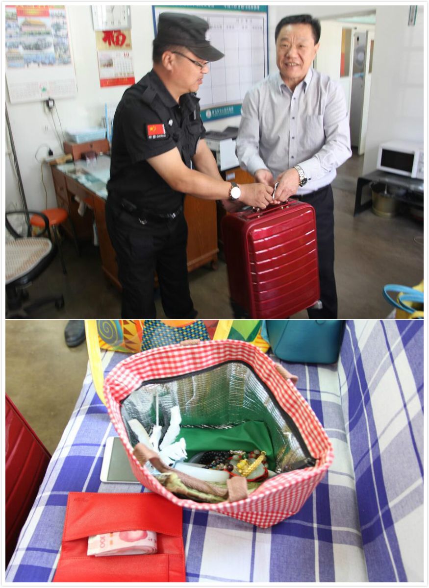 10月9日,我国传统的重阳佳节,一名年逾五十的老太将装有近两万元现金和多件首饰、挂件以及身份证件等物品的提包和一个行李箱(带密码锁未打开)遗失在医院门诊二楼,被巡查的安保人员发现,在等候了半个小时后未见到失主的情况下,通知了派出所,并顺利找到了失主的老伴,经过核查后,失主家属领走了失而复得的现金和物品。