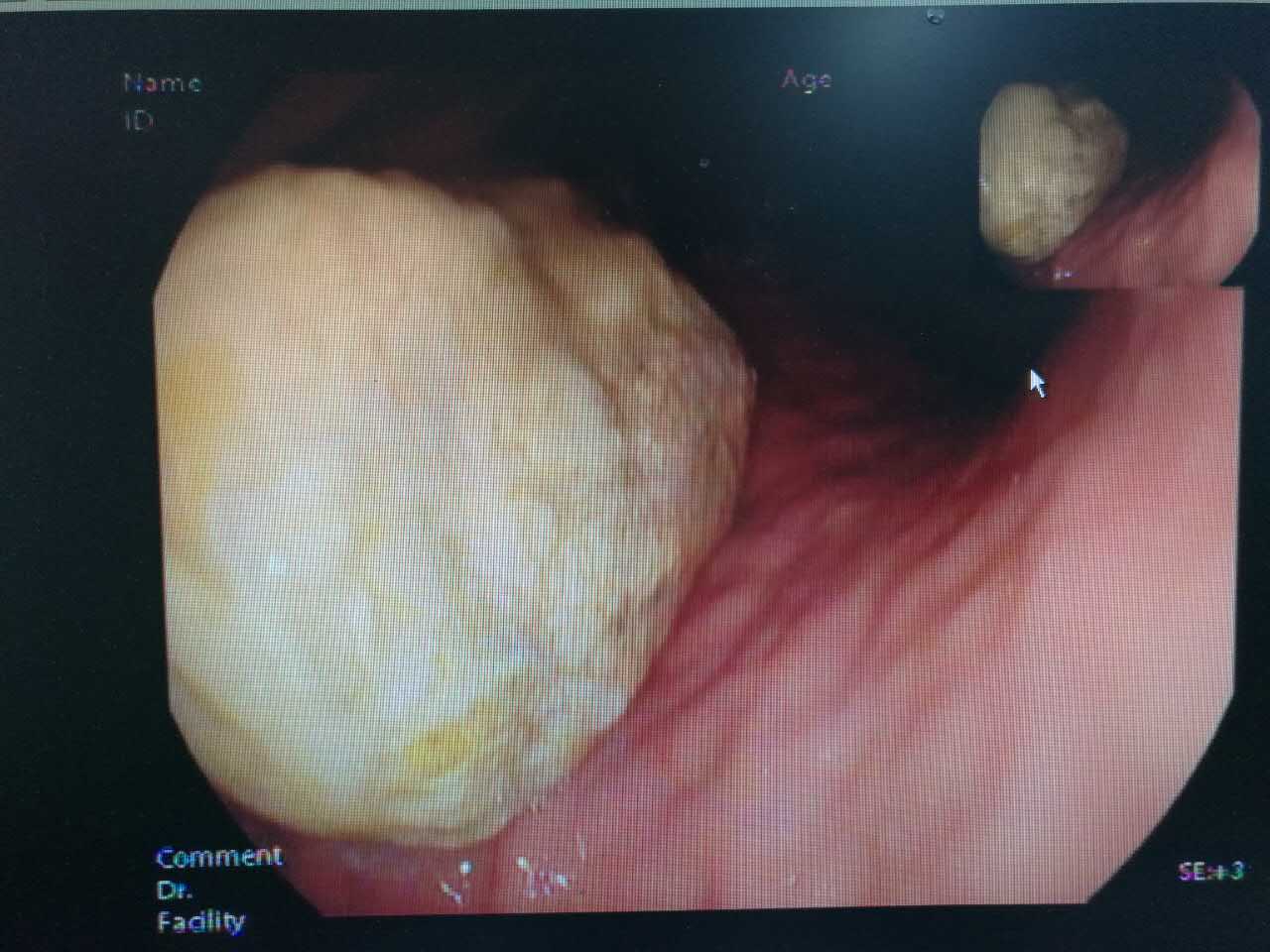 今年70岁的蔡大叔也因进食山楂及冬枣出现上腹部不适、腹胀、腹痛、烧心等症状,到医院就诊。本部消化内二科胡豆豆医生会诊后,与内镜中心医护人员立即为她进行了急诊胃镜检查,发现蔡大叔胃内有一约3*4cm大小的球形胃结石,并且胃粘膜已出现多发溃疡和渗血,不得不住院,准备进行胃镜下碎石治疗。