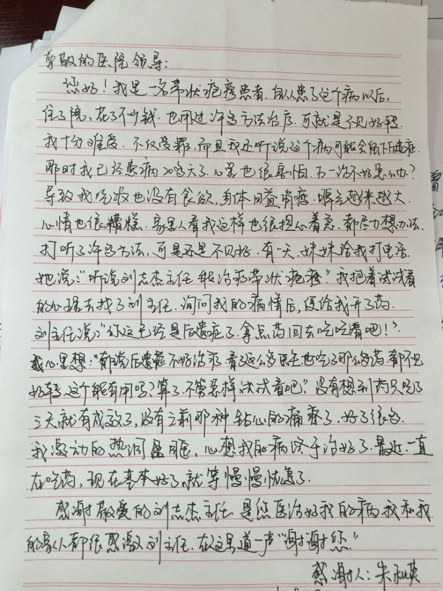 患者朱某某,女,50岁,来山东青岛中西医结合医院就诊时已患带状疱疹20天,之前在本市某大医院住院治疗,虽然疱疹都已消退,但患病的下肢仍钻心的疼痛,吃遍了西药也不见效。导致患者心里害怕,食欲不振,身体日益消瘦,脾气也越来越大,心情也很糟糕。后来慕名前来找医院预防保健科刘志杰主任诊治。刘主任接诊后采用中医治疗,没想到药只吃了三天就有好转,治疗一段时间后基本就好了。患者十分感激,送来感谢信和锦旗以表达感谢之情。