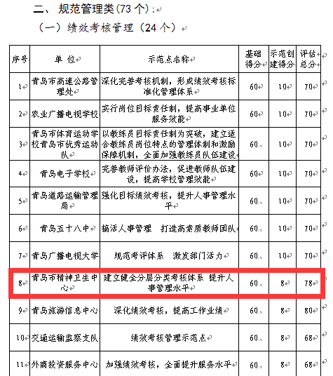 近日,青岛市人社局开展事业单位人事管理示范点创建活动,中心申报的“建立健全分层分类考核体系,提升人事管理水平”、“内部培养与外部引进并举,加强中心人才梯队建设”两个创建项目,双双通过人社局综合评估,两项最终得分均位列卫生系统第一名,荣获“青岛市事业单位人事管理示范点称号”。这是中心继2014年、2015年被评为市级人事管理示范点后,第三年获此荣誉。