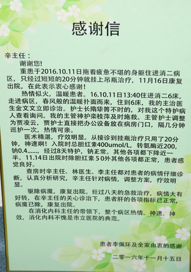 表扬信中,老人家感慨地说,“我们的医生是神医,我们的护士是神护!”老人很庆幸当时决定来到这里治疗,辛主任凭借精湛的医术,为他制定出效果极其显著的治疗方案,使他得到重生;金文文医师在辛主任的指导下及时调整治疗方案,精准治疗,出院时各项指标恢复正常,他的贴心解答,也让老人家准确掌握了自己的病情和治疗方案,能够积极配合治疗,早日康复出院。