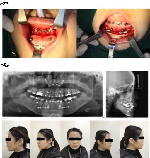 1、拔除14、24、34、44,双颌前牙区根尖下截骨,后退4mm,钛板内固定。