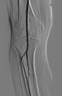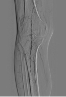 患者林某,80岁,于20年前诊断为“2型糖尿病”,因“右足破溃、疼痛10天”以“2型糖尿病性足溃疡和周围血管病”第一次住院。经治疗破溃无好转。出院后坏疽逐渐加重,近日再次入院。经下肢血管彩超检查诊断为下肢动脉粥样硬化闭塞症,患者因下肢动脉闭塞缺乏血流供应,伤口不愈合,拟行截肢术。为改善患趾血流,在征得患者与家属同意后,内分泌科组织于DSA下进行手术,术中造影见患者右股动脉起始部狭窄,中段串珠样狭窄,收肌管处股动脉闭塞,膝下胫前动脉、胫后动脉、腓动脉无显影。术中给予股动脉支架植入,胫前动脉和腓动脉球囊扩张术。术后造影显示股动脉、腘动脉血流通畅,胫前及胫后动脉血流通畅,足背动脉血流好。