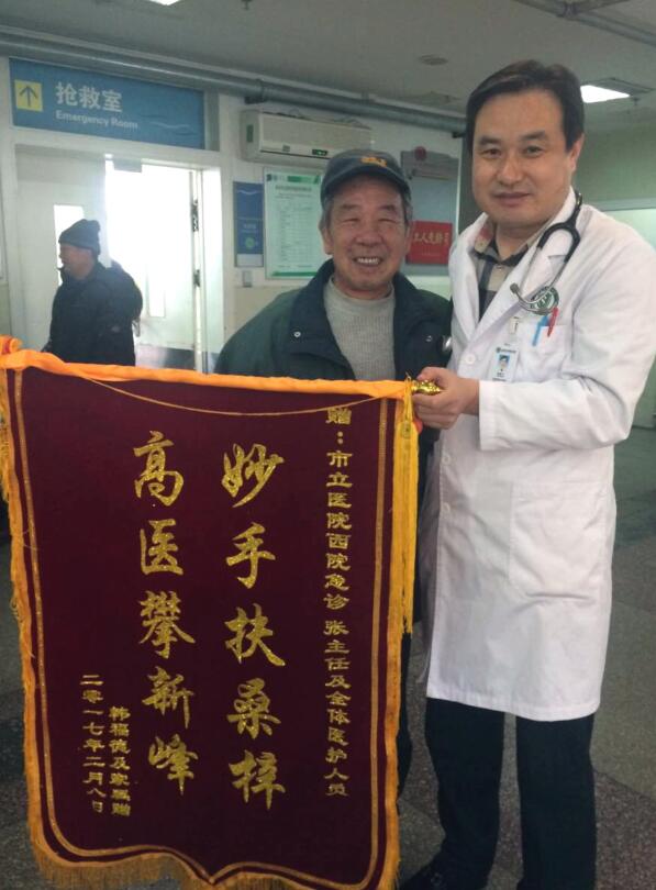 二十多天前,68岁的韩大爷突发“心脏骤停”,青岛市市立医院本部急诊科的医护人员为他进行了长达70多分钟的“插入式腹部按压”心肺复苏和紧急救治,最终成功挽回他的生命。近日,劫后余生的韩大爷亲自回到医院,送上一面锦旗,感谢张泉三主任和医护人员的精湛医术和“不离不弃”的高尚医德情操。