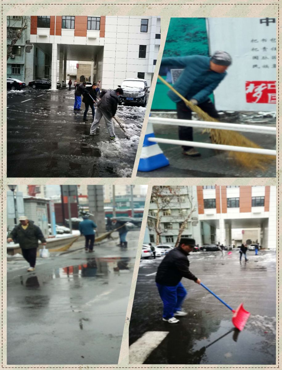 早上5:00,物业办迅速组织四十余名保洁人员,拿着铁锨和扫把、推雪工具及小车等用具,冒着寒风和雨雪,对全院的各个进口出口,车辆路面,行人道等积雪的地方进行清扫,经过两个半小时的突击,院内的道路积雪全部清理,没有影响大家上班和病人就诊,有效保障了病人和职工的安全。