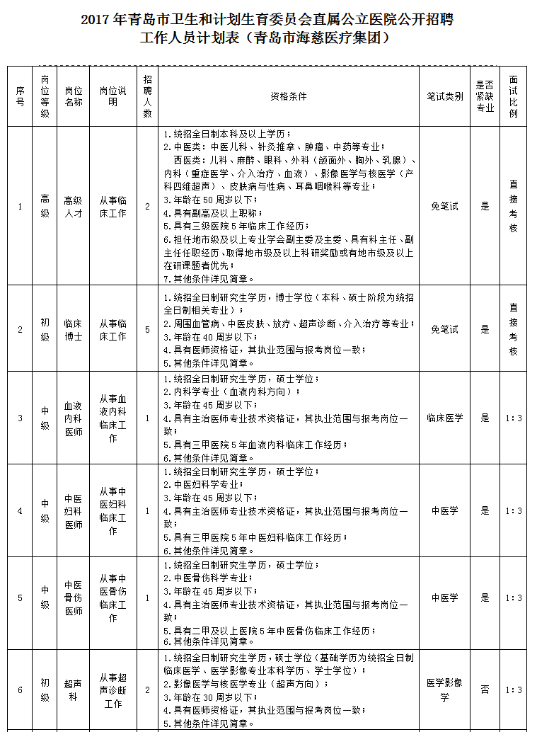 青岛市海慈医疗集团是青岛市卫计委直属三甲综合性公立医院,根据国家、省和青岛市有关招聘规定和要求,2017年集团面向社会公开招聘151名专业技术优秀人才,欢迎报考。招聘简章及计划表详见网站http://www.qdhrss.gov.cn和http://www.wsrc.cn,咨询电话:83777067(工作时间内)。