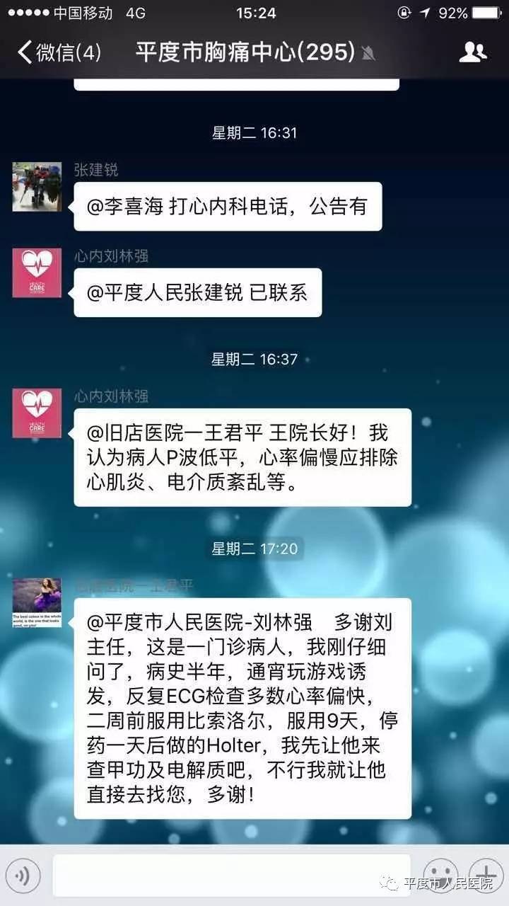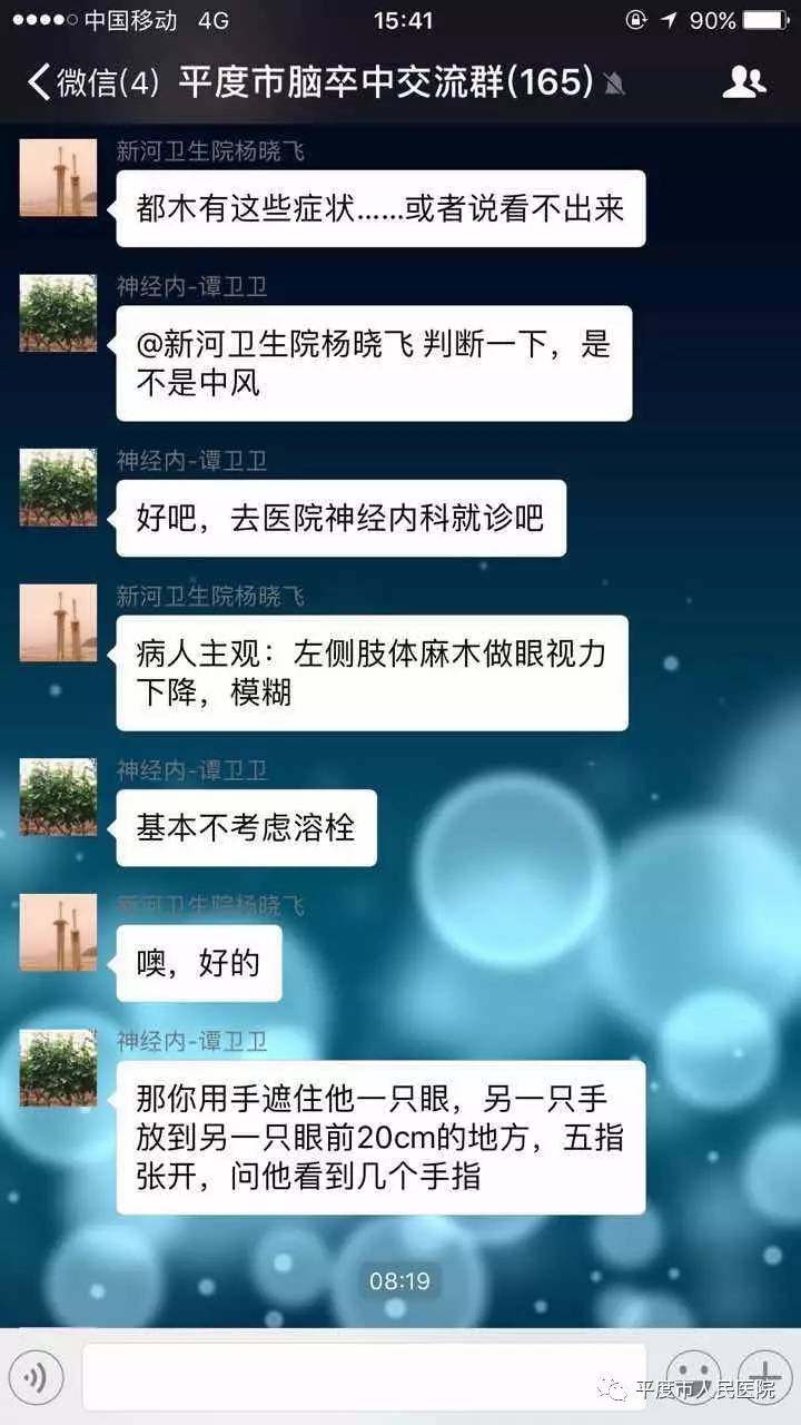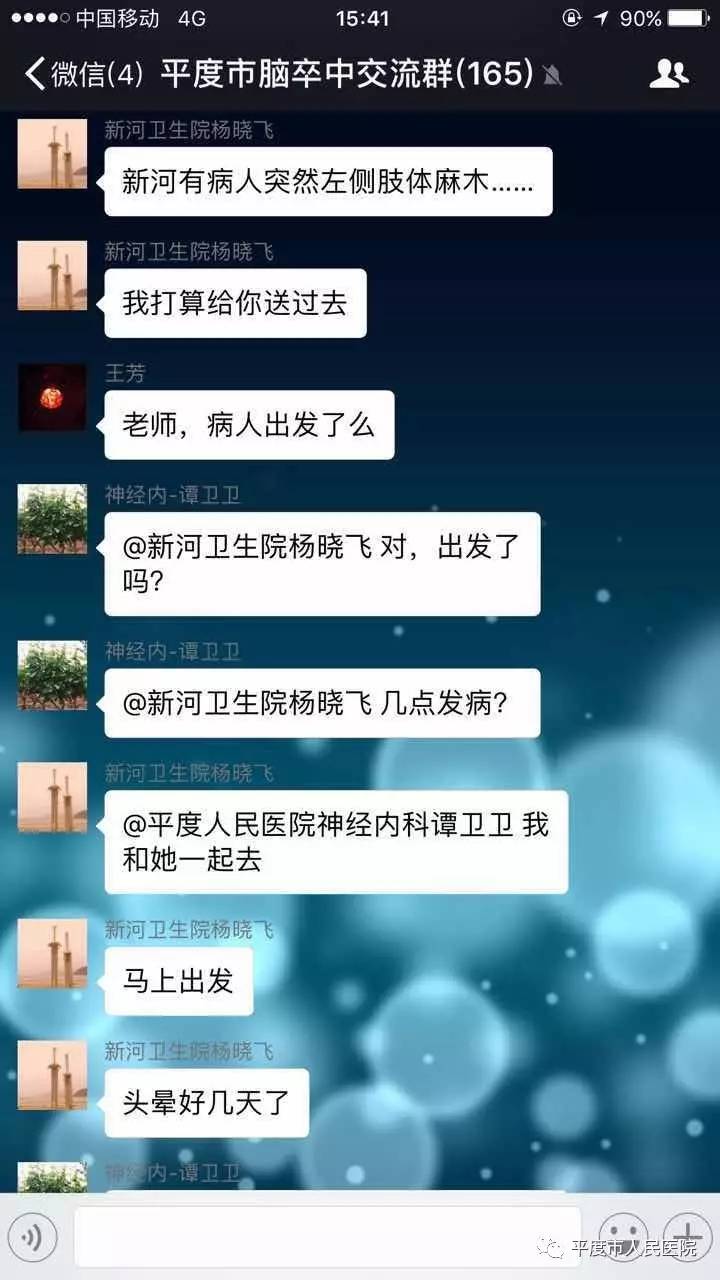 患者李某就是通过医务志愿者微信群的快速沟通得到有效救治的病案之一:医务志愿者、平度市人民医院神经内科主治医师谭卫卫,依托于平度市卫生计生局健康彩虹志愿服务大队的平台搭建了“平度市卒中交流群”。当明村卫生院的医师胡磊接诊一名失语并右侧肢体活动不灵的患者时,当即在卒中交流群里通报了病人情况,联系上了市卒中中心的大夫。随后,相关一环扣一环的救治措施在群内传递,在患者到达医院的时候,各个环节的救治工作准备就绪并在患者到来之时迅速展开,无缝隙的衔接,为患者救治赢得了宝贵时间,目前该患者康复情况良好。