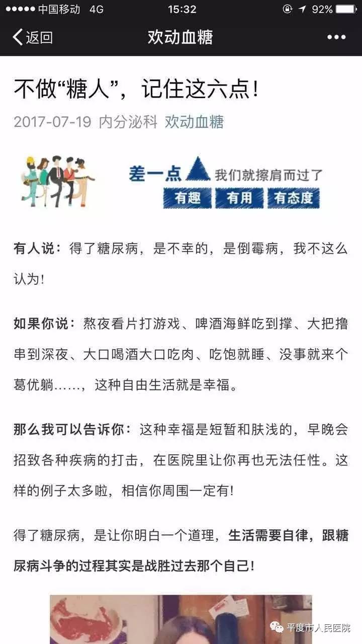 内分泌科主任张春玲,是医院一名资深医务志愿服务者,曾获得过平度市十大杰出青年称号。在医院倡导科室建立微信公众号、搭建微信朋友圈为患者提供服务之时,张春玲便在科室内动员医护人员充分发挥自己的特长,下大力气完善丰富科室微信平台公众号“欢动血糖”。公众号定期推送科室服务项目、患者就诊注意事项、健康保健知识等,丰富实用的内容,吸引了众多粉丝。该平台也成为志愿服务的有效阵地。