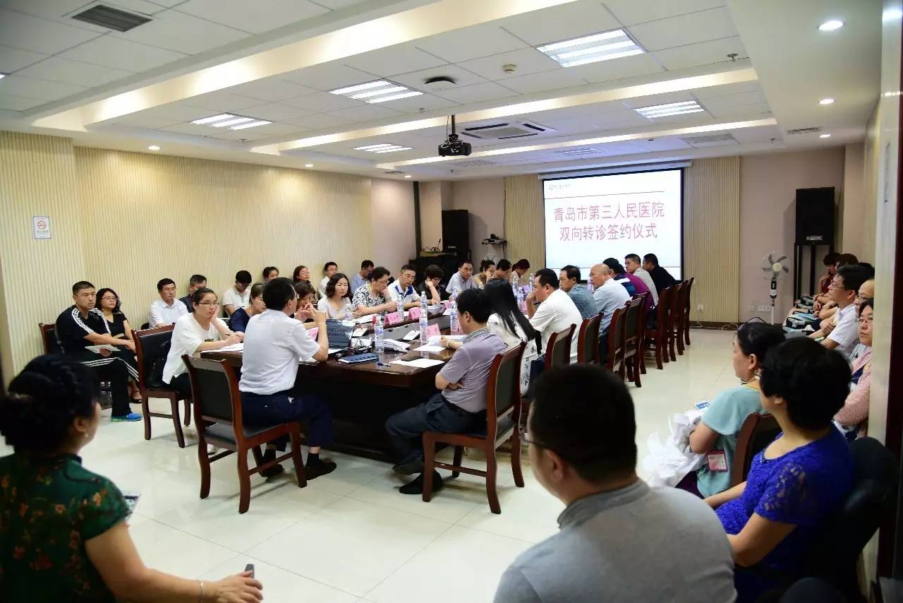 2017年7月27日下午三点,青岛市第三人民医院二号会议室座无虚席,在市第三人民医院新院区搬迁三周年之际,为了更好的落实卫计委下发的做好“分级诊疗双向转诊”工作要求,特邀请李沧区卫计局领导和李沧区所有社区卫生服务中心的主任,到市第三人民医院签署双向转诊协议,与21家医联体合作的基层医疗机构进行了签约。