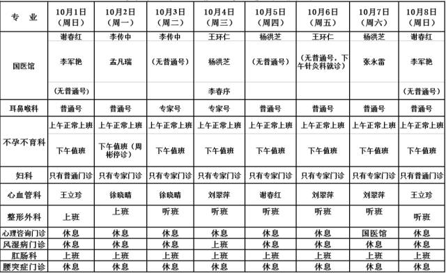 以上为门诊部分科室国庆假期排班,其他科室出诊情况同往常一样。