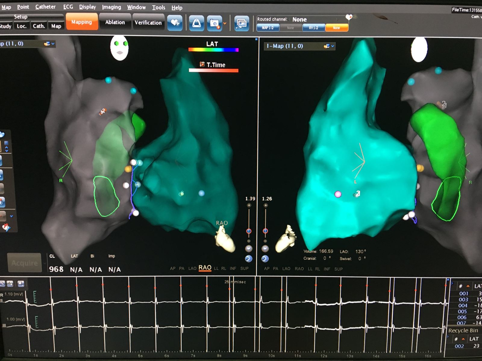 经过严谨论证和多次反复推练,11月22日早晨,路军主任带领心脏电生理团队为郑先生施行了“零射线心脏永久性起搏器植入术”。医生们首先穿刺左侧锁骨下静脉,制作好起搏器囊袋;随后,路军主任经右侧股静脉置入导航导管,快速解剖构建右心房模型,重点标记右心房一些重要解剖标志,以及起博电极需要植入的位置,这对于精准固定起搏器电极,降低耗电量、良好起博心肌至关重要;最后,医生们应用三维标测系统电定位导管可视化原理、可视化导丝技术,将导线置入预定取点位置,依次测试起博各项参数、固定电极,顺利完成手术。