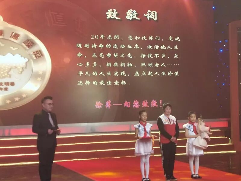 “危急关头,挺身而出,毫不犹豫伸出手臂,为他人献上宝贵的血液。20年光阴,您和伙伴们,变成随时待命的流动血库,激活他人生命,点亮希望之光,显示出大爱无疆的高尚品格。”