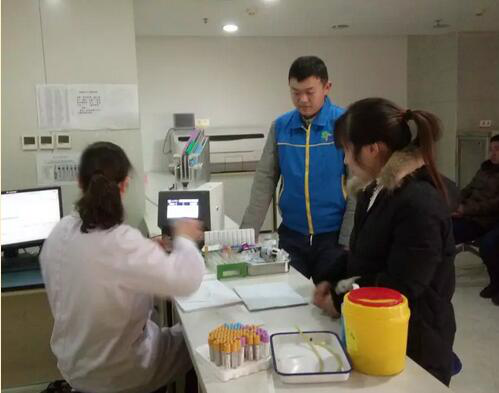 在检验大厅,小志愿者协助检查患者采血刷卡、维持秩序。