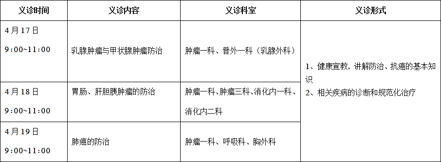 为传播科学理念、普及抗癌知识、提升人民群众的防癌意识、让群众科学认识癌症、树立癌症可防可治的正确观点,建立健康的生活方式,实现对癌症的有效防控。在“全国肿瘤防治宣传周”期间,青岛市市立医院本部院区和东院区将举办系列大型义诊,肿瘤科、普外一科(乳腺外科)、消化内科、呼吸科、胸外科等专业的专家,将为市民联手献上免费的科普讲座及咨询。
