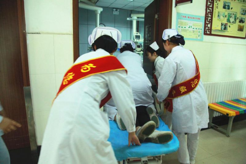 应急演练模拟临床工作现场,殷雪华护士长在门诊分诊巡视时,发现一名中年女性患者表情痛苦、面色发绀,殷护士长发现患者已经失去意识,心脏突发骤停!