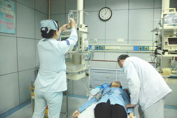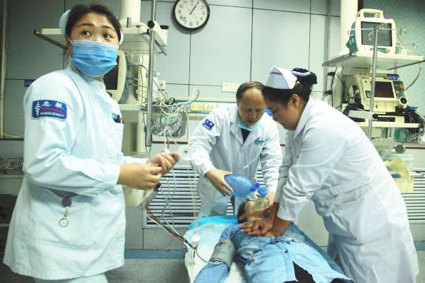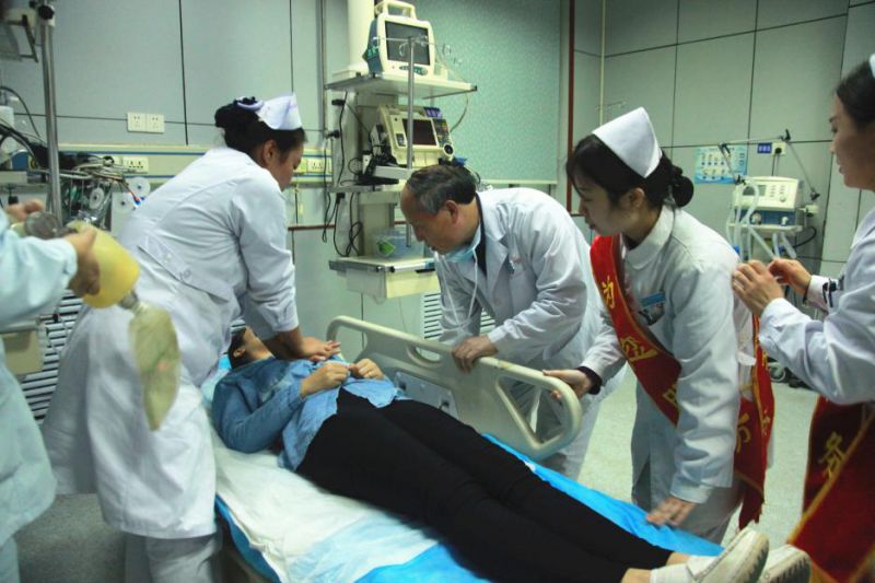 紧急气管插管,开放呼吸通道,应用呼吸机,建立静脉通道,注射肾上腺素,血气分析……经过一系列抢救措施,五分钟后,患者恢复自主呼吸,大动脉搏动恢复,面色由紫绀变为红润,患者抢救成功!医护人员们继续对患者进行监护,急诊科主任周进科对其实施相关治疗措施。