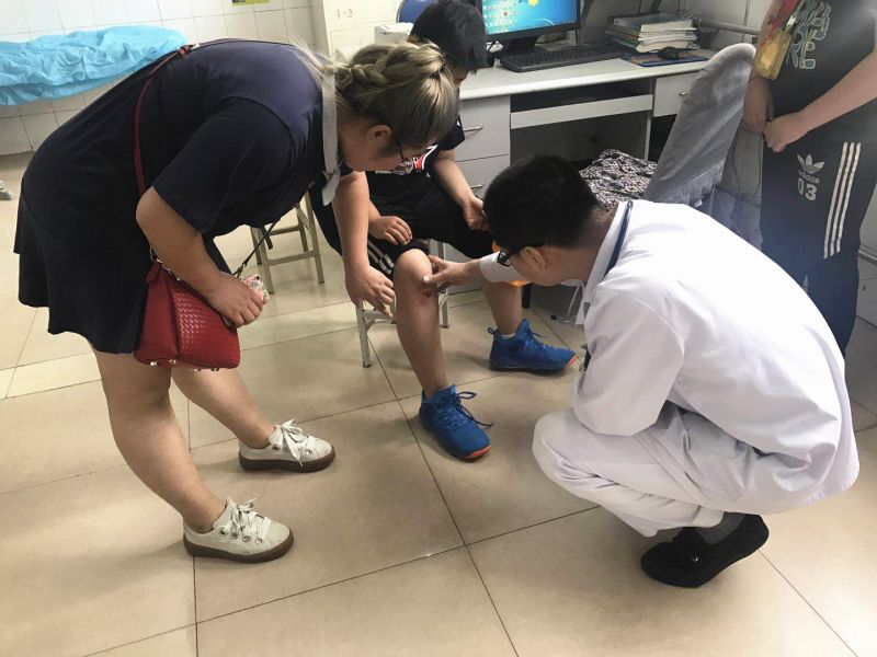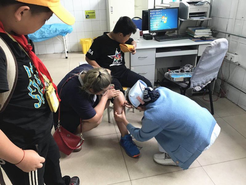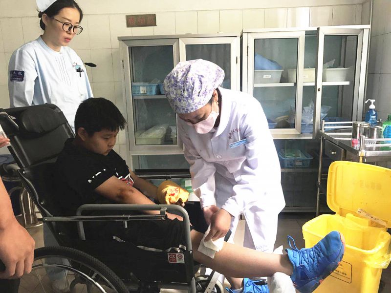 行色匆忙的路人中,有一群神色慌张的孩子格外显眼。一个受伤的男孩被围了起来,膝盖和胳膊的伤令他半蹲在地上无法行动,血从摔破的裤子渗了出来。原来,活泼好动的小尹在跳下台阶时没有站稳,直接跪倒在地并造成了膝盖和胳膊的外伤。新区中医医院输血科封昱如和宣传科曹琰炜恰巧路过,两人第一时间迎上前去查看了情况。