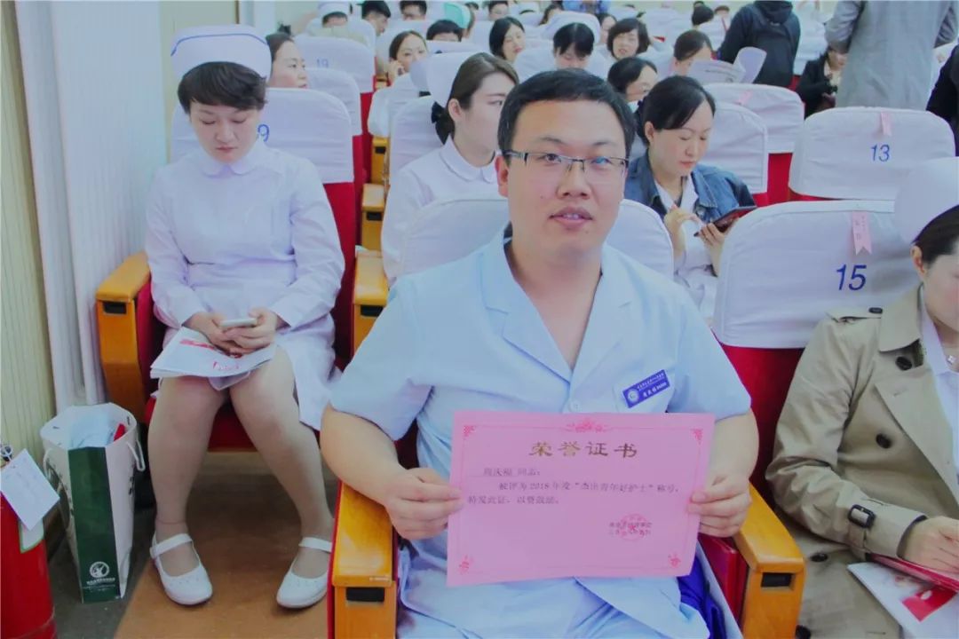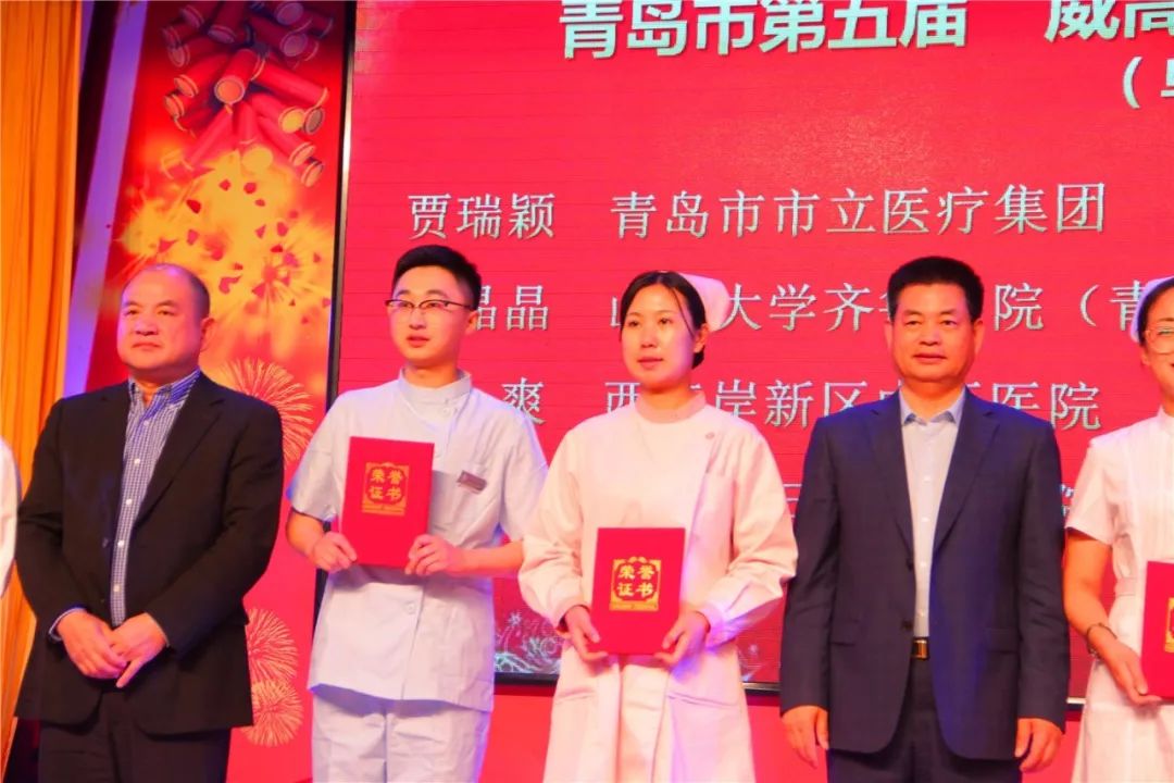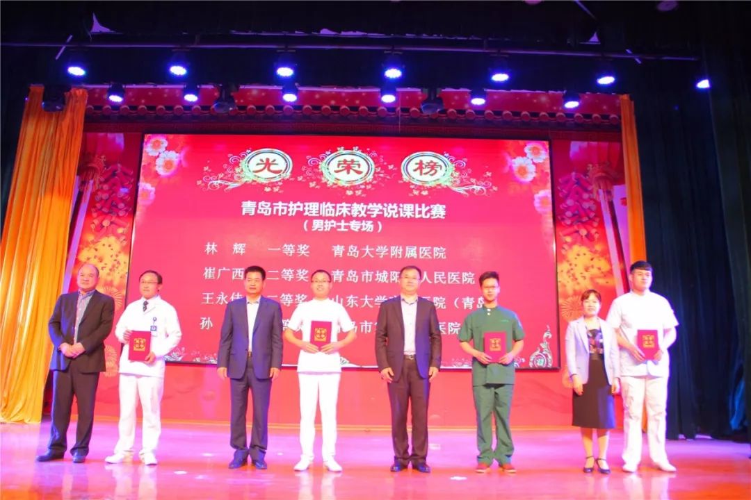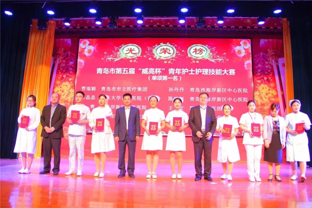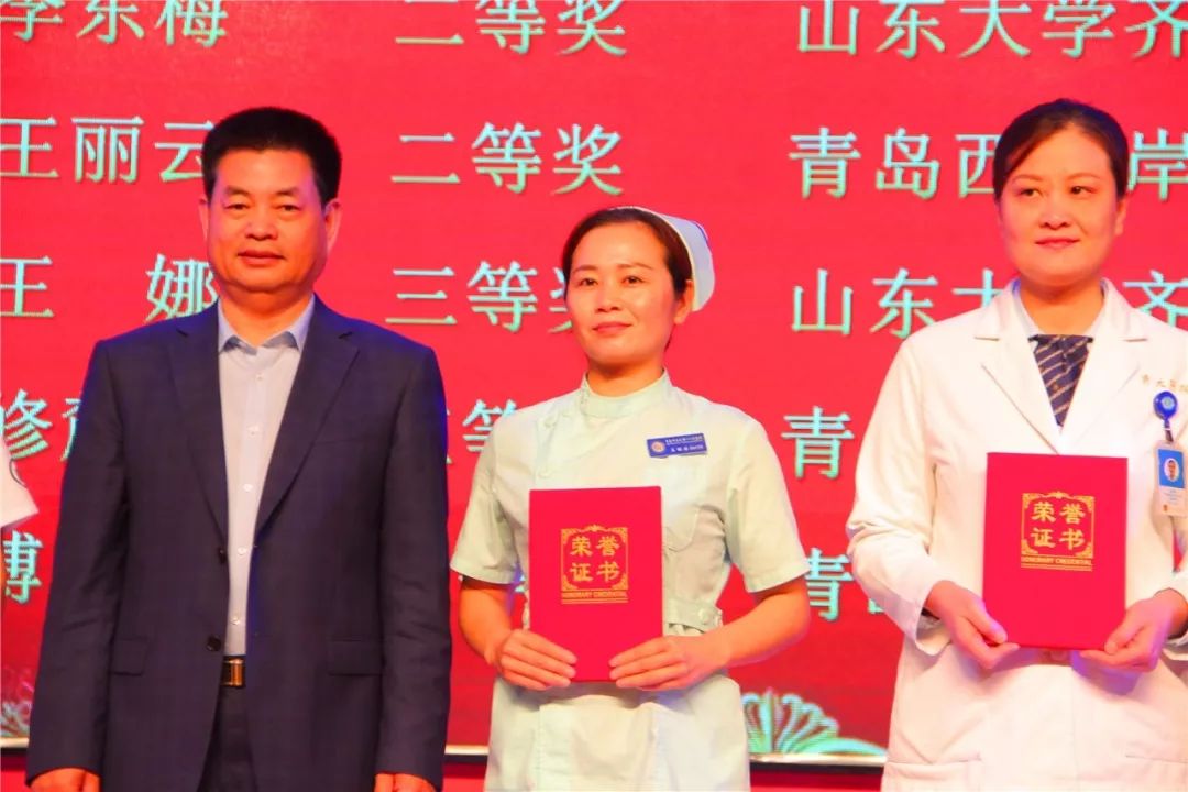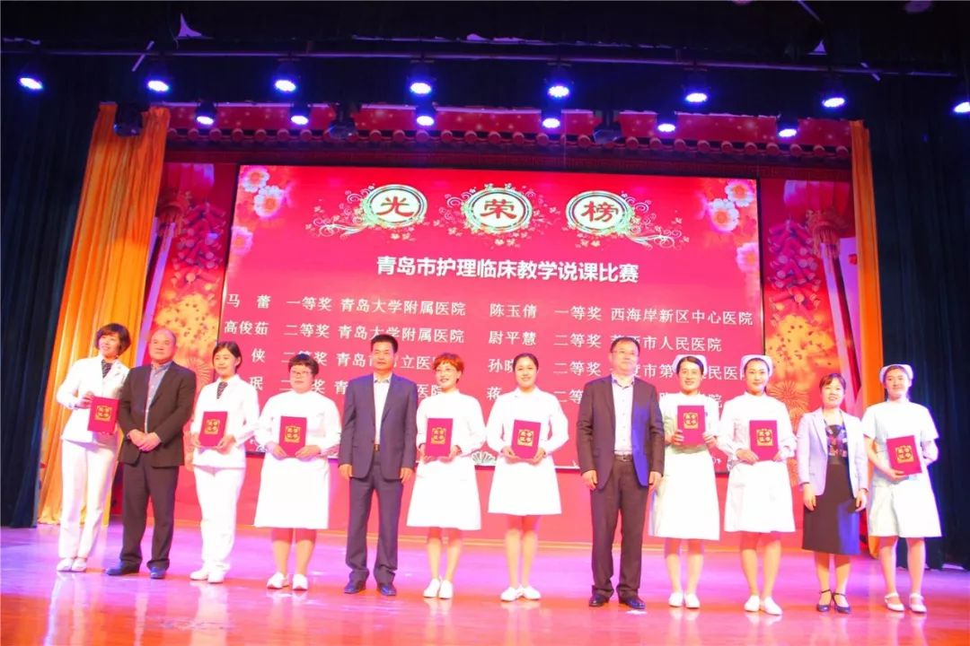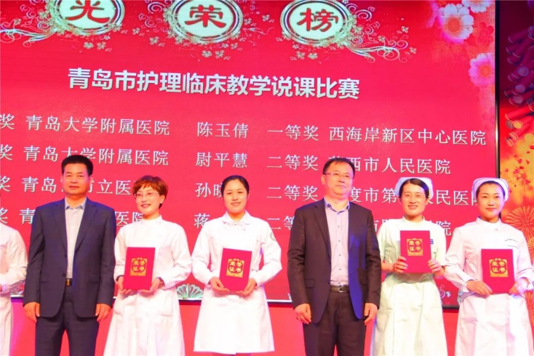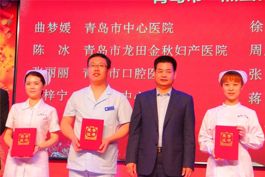 西海岸新区中心医院牟雪梅、周庆福、王丽云、陈玉倩、陈炜恒、孙丹丹、丁桂伟、王冬萍和袁青上台领奖,她(他)们囊获了青岛市卫生计划生育委员会优质护理服务标准化沟通情景展示一等奖、青岛市“杰出青年好护士”、青岛市护理学会首届“护理科技创新奖”、“青岛市护理临床教学说课比赛”个人第一名、青岛市第五届“威高杯”青年护士护理技能大赛个人单项第一名、青岛市“杰出护理工作者”和青岛市“健康守护三十年好护士”所有的奖项。