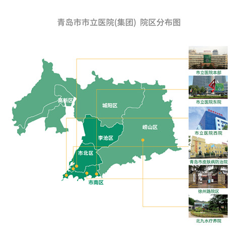 目前,市立医院集团拥有本部、东院区、西院区(九医)、皮肤病院、北九水疗养院、乳腺病院六大院区,3000余床位,年门诊量230万、住院病人12万、手术5万余台,“医联体”理事单位已达43家,覆盖贵州安顺、青岛市南、市北、崂山、李沧、黄岛、城阳、即墨、莱西等省区市,形成集医疗、教学、科研、保健、康复、公共卫生6大功能为一体,以三甲医院为核心、二级医院为枢纽,上下贯通、分级诊疗畅通的大型医疗集团。