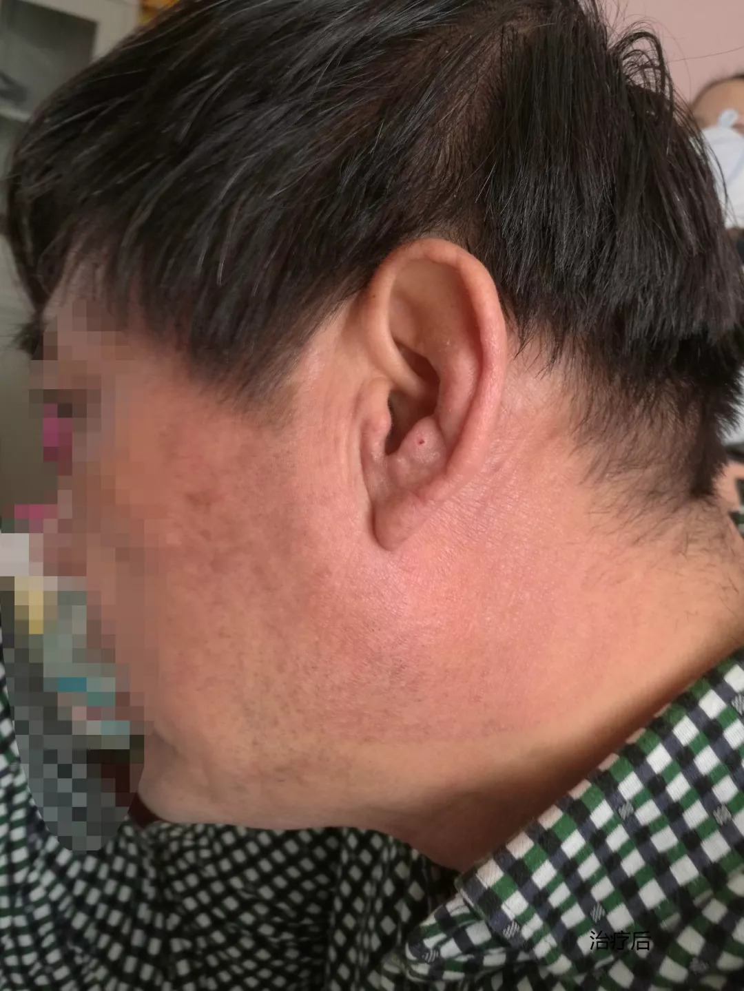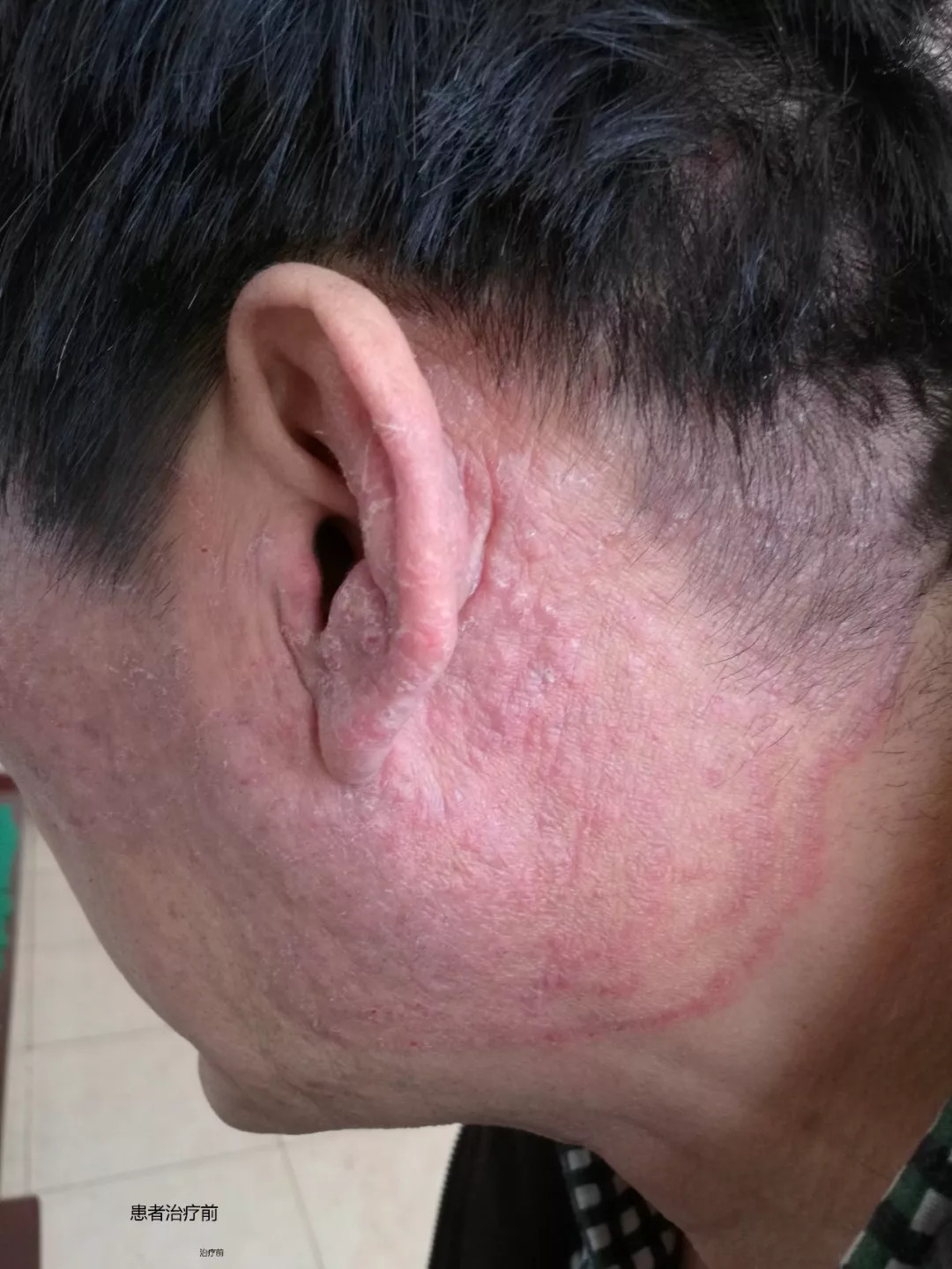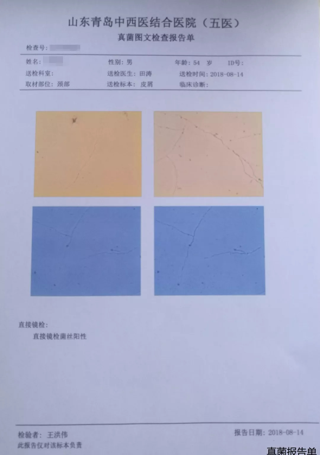 近日,皮肤科田主任在专家门诊接诊了一位杨先生,就诊时症状表现为:脸颊及颈部大片红斑、丘疹,瘙痒。在社区医院诊断为湿疹过敏,应用激素类药膏治疗一个月,皮疹未见好转,病情反而加重且范围扩大。田主任凭借丰富的临床经验初步诊断为真菌感染导致的体癣,于是利用皮肤真菌检测图文报告系统进行真菌检测,在显微镜下发现大量漂亮的菌丝,呈竹节状,晶莹剔透,是非常典型的真菌感染,可以确诊为体癣,经过抗真菌治疗一周后,患者痊愈。