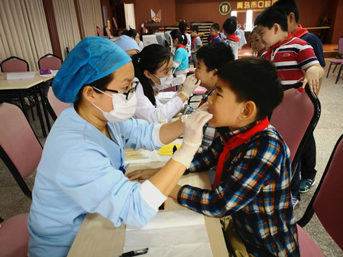 前期,中国牙防基金会专家就项目理论和操作、牙齿涂氟技术、口腔健康教育技巧等知识进行深入培训,并为合格执行医疗单位授牌,青岛市口腔医院成为第一批合作医疗单位。医院根据项目要求,联合市南区教体局组织选定德县路小学、八大峡小学等六所小学的1000名适龄儿童,由专业医务人员为其开展口腔健康教育、口腔健康检查、牙齿涂氟等一系列口腔疾病防治服务,建立口腔健康档案,并将连续三年追踪参与这1000名儿童的口腔健康情况。