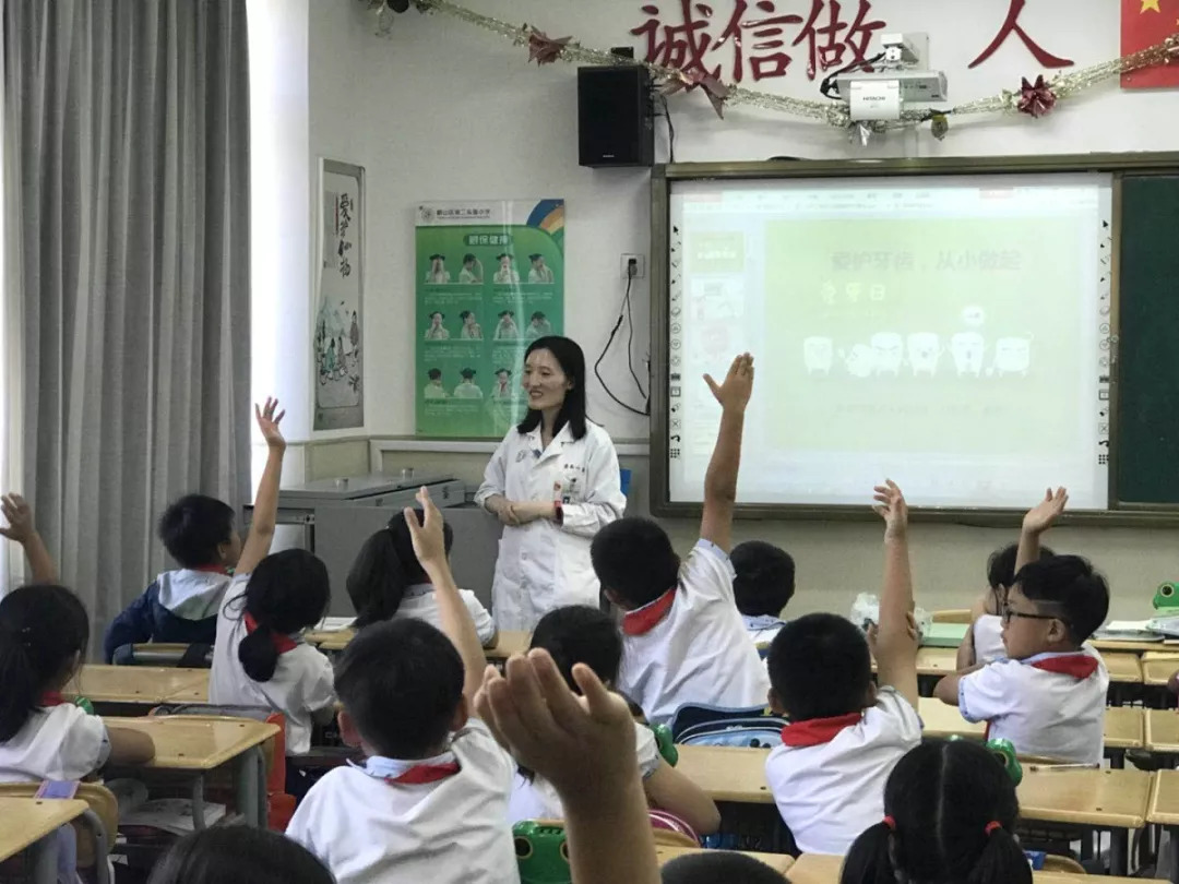 为响应爱牙日主题,提升口腔保健水平,9月17日,我院开展了“牙齿健康”进校园活动。口腔科和省级青年文明号心内科的医护人员走进崂山区第二实验小学,给孩子们进行牙齿健康知识讲座和义诊。医护人员用图文并茂、实物教具结合现场讲解的方式向孩子们普及牙齿健康知识,包括牙齿的重要性、牙齿易发生的疾病、日常生活中如何预防口腔疾病等,并与他们互动,让他们参与操作演练正确的刷牙方法。