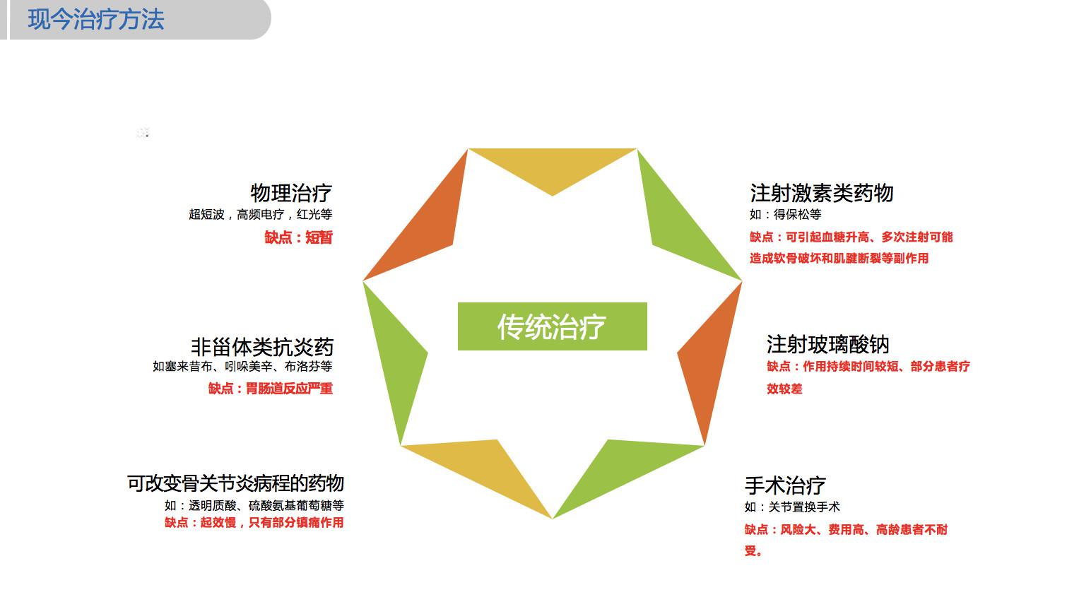 目前主要的治疗方法有保守治疗和手术治疗。保守治疗主要包括:药物治疗、注射治疗和物理治疗。手术治疗则为目前较为常见的膝关节置换术。