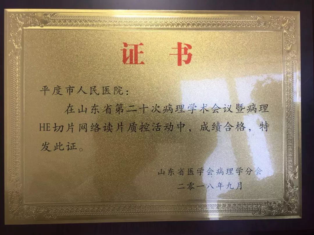 科室高度重视规范化管理,标准化操作,人性化服务,注重品牌建设,注重服务质量、服务内涵的再提升,先后获得青岛市医学会病理专科学会先进单位、第四届“健康杯”病理技能大赛二等奖及暨中国病理装备分会第一届技术质控竞技比赛三等奖等荣誉,通过全方位的综合提升全力打造平度市及其周围区域性的病理诊断中心。