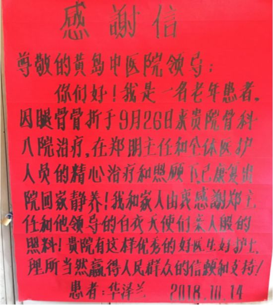 华大妈在信中特别提到了骨伤二科郑鹏副主任,作为主管医生的郑主任不仅为她成功实施了手术,平时亲切的话语和无微不至的关怀也让她感受到亲人般的温暖。最让老人和家属感动是:郑主任多次谢绝了老人子女送红包和请客吃饭的请求,在手术室麻醉过程中老人出现了大便失禁的情况,郑主任亲自为她擦拭干净,保证了手术的顺利进行。在整个住院期间,老人不仅得到了医生的专业治疗,还感受到骨伤二科护理团队的温馨服务,折射出青岛西海岸新区中医医院服务患者的业务能力和人性化服务。
