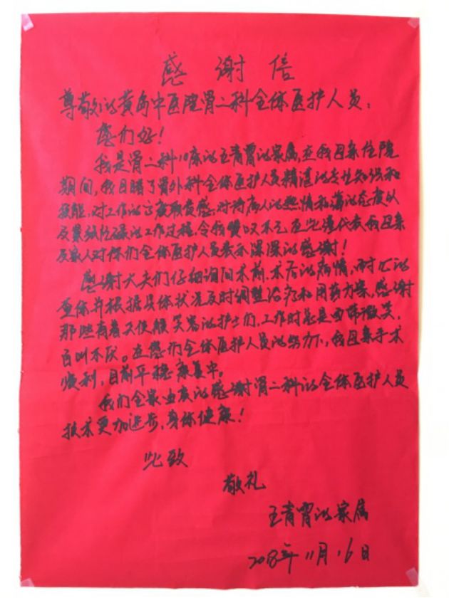 像这样的感谢信骨伤二科收到过很多很多,类似这样感动人心的故事也数不胜数。这一封封的感谢信是患者对我院医疗质量和服务水平的最大肯定,这一封封的手写书是患者对医护人员精湛的专业技能、热情的服务态度的高度褒奖,这一幕幕医患情在当下这个社会的医患环境中如一股清流,时刻鼓励和鞭策着骨伤二科全体医护人员不忘初心、不断进取。在今后的工作中他们将继续秉承“以病人为中心”的工作宗旨,怀敬畏之心,景仰生命,用真心、爱心为患者解除痛苦,赢得广大患者的认可。