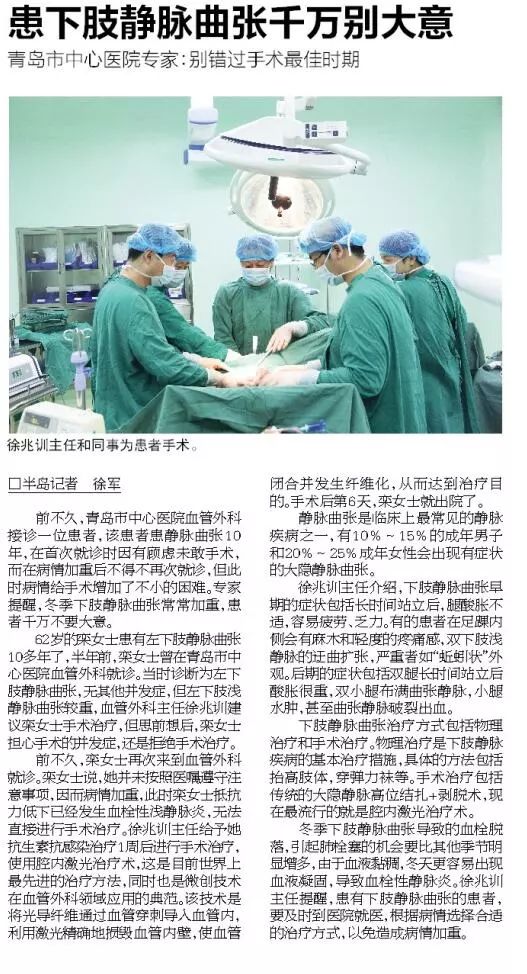62岁的栾女士患有左下肢静脉曲张10多年了,半年前,栾女士曾在青岛市中心医院血管外科就诊。当时诊断为左下肢静脉曲张,无其他并发症,但左下肢浅静脉曲张较重,血管外科主任徐兆训建议栾女士手术治疗,但思前想后,栾女士担心手术的并发症,还是拒绝手术治疗。徐主任告诉她一些注意事项后,栾女士返回家中。