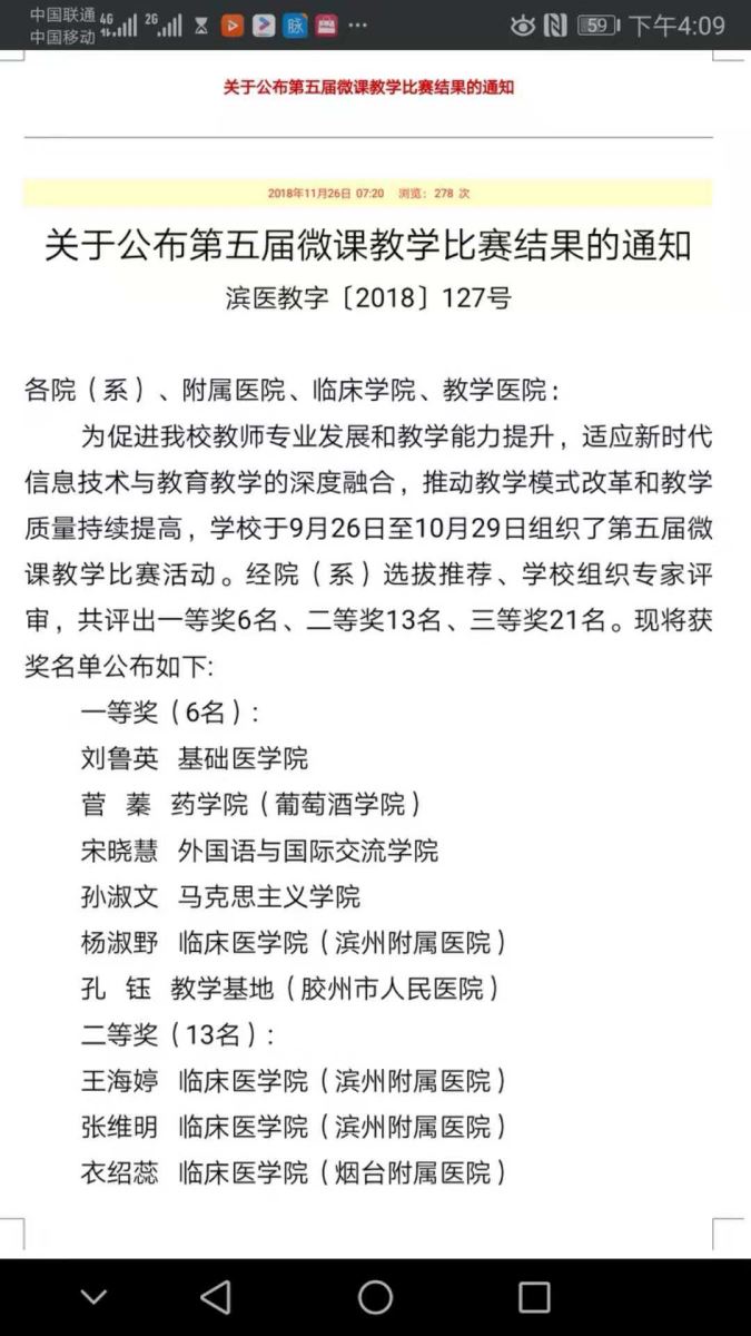 近日,滨州医学院组织各院(系)、附属医院、教学医院进行微课视频教学比赛,市人民医院参赛选手孔钰经过比赛视频、授课课件、教学设计三个环节的评比,得到专家的一致认可,获得一等奖的好成绩。