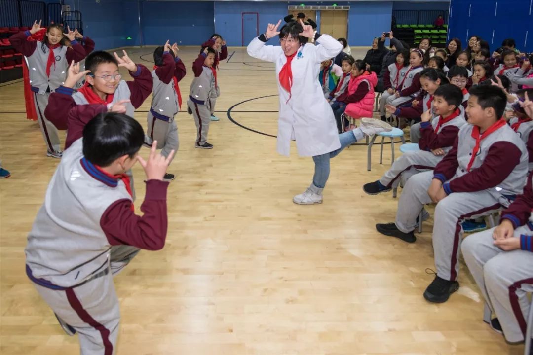 揭牌仪式后,中医药专家志愿者分四个会场为孩子们进行了丰富多彩的健康科普讲座。在主会场,针推康复科孙炜副主任医师带领四年级级部的同学们学习中医传统保健操——五禽戏,她手把手教同学们练习了虎戏、猿戏、鹤戏、熊戏和鹿戏的基本动作,还告诉大家五禽对应的身体的五脏,多加练习可以强身健体,同学们学习的十分认真和投入,把各种动物的招式表现的惟妙惟肖。