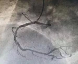 患者由心血管科迅速转运至介入诊疗室,田军主任医师和徐林东副主任医师在局麻下,经右侧桡动脉穿刺行冠脉造影检查发现:患者右冠状动脉远段完全闭塞,血流完全中断,必须行PCI治疗开通闭塞血管。迅速将病情告知家属并再次征得同意后,紧急行右冠状动脉远段球囊扩张术及支架置入术。在为患者成功置入一枚支架后,造影显示支架膨胀良好,血管狭窄消失,血流恢复正常,患者胸痛症状完全消失,转危为安。