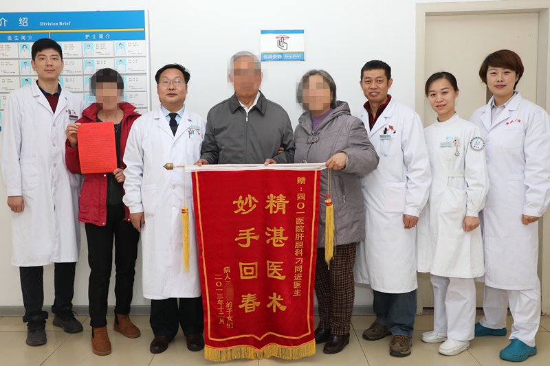 患者送来感谢信,其父母带来当年赠送给刁主任的锦旗与肝胆外科工作人员一起合影